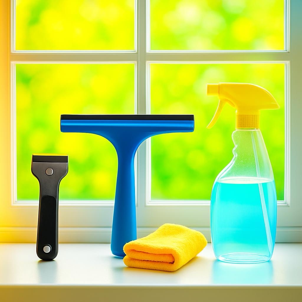 Whenever I cleaned houses for a living I would also carry around with me a flat razor blade scraper and a squeegee.